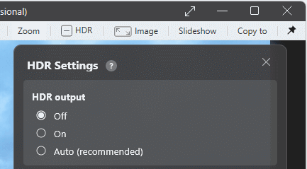If you select Auto, HDR images are displayed with HDR output, while regular SDR images are displayed with SDR output.